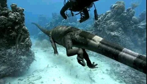 Tanystropheus featured in Sea Monsters and appeared in The Sixth Most Dangerous Sea, the Triassic of 230 Million Years Ago. However, the main hazards for this sea were Nothosaurus and Cymbospondylus. Tanystropheus was just a local inhabitant Nigel Marven happened to come across. Nigel manages to sneak up behind it and grab its tail, only for it to come off, like some lizards today.