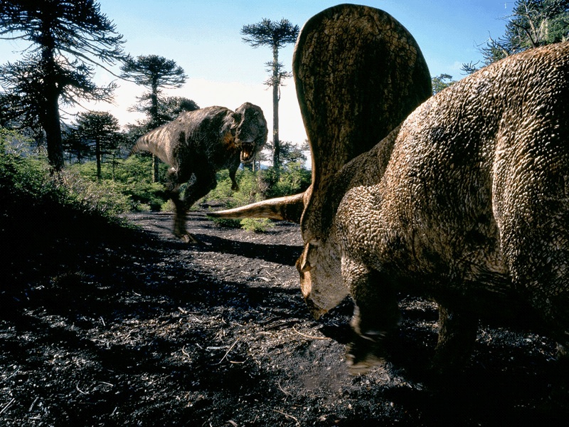 An injured old Torosaurus faces off against a deadly but naive young Tyrannosaurus.